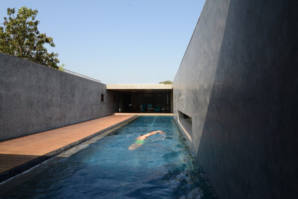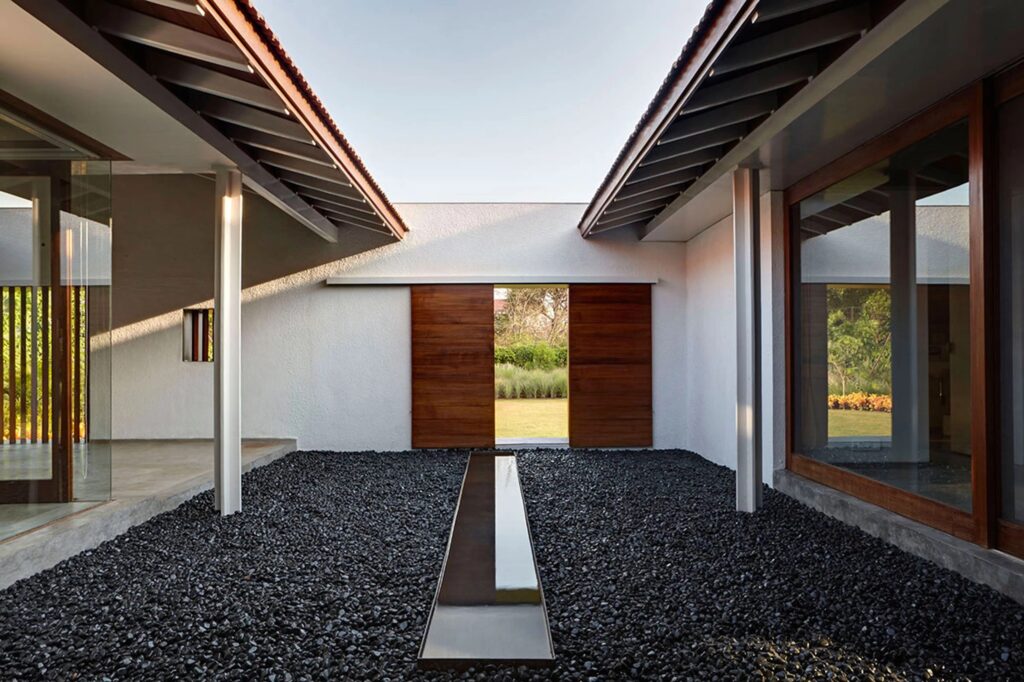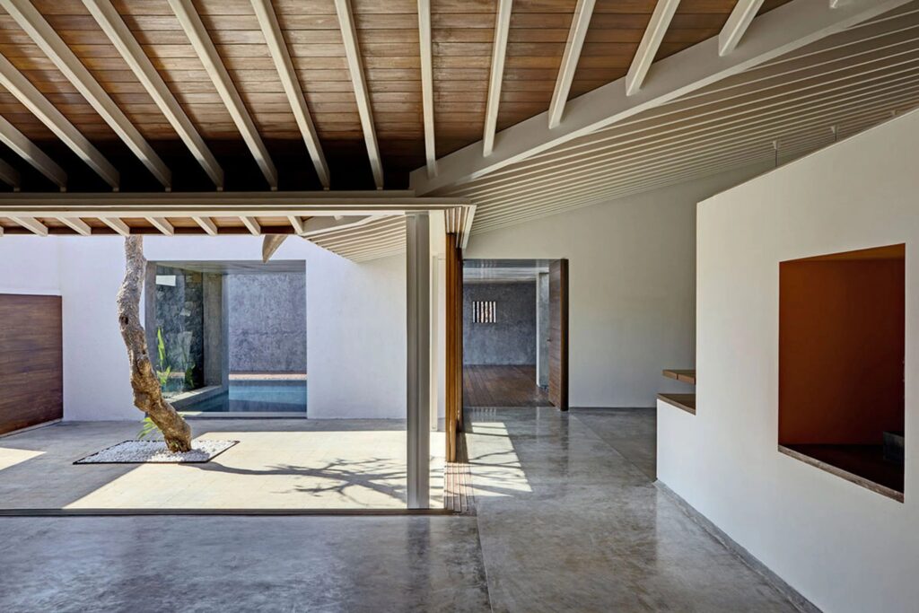 Разположена в крайбрежния град Алъбаг, щата Махаращра, Индия, „Къщата с трите двора“ е проект на студио „RMA Architects“. Завършена през 2014 г., къщата е пример за архитектура, адаптирана към социалния и физически контекст на мястото.