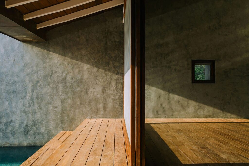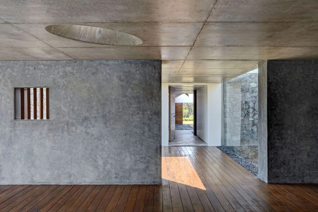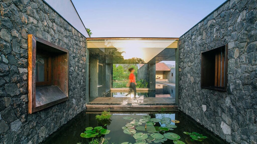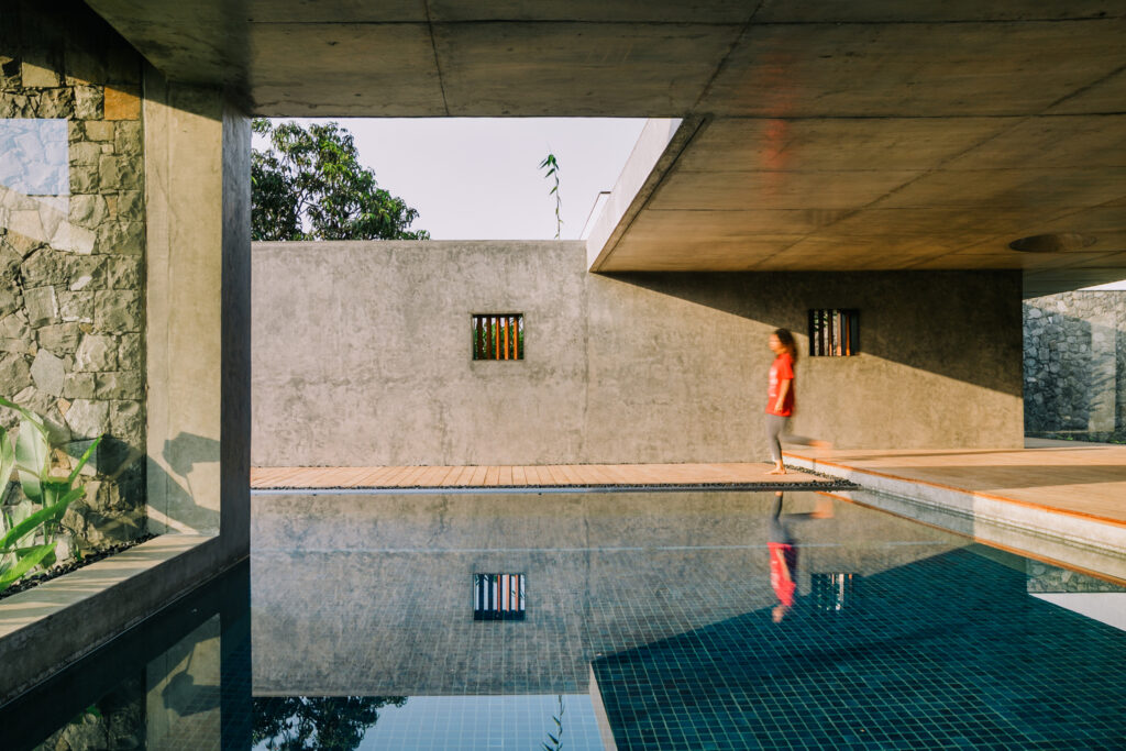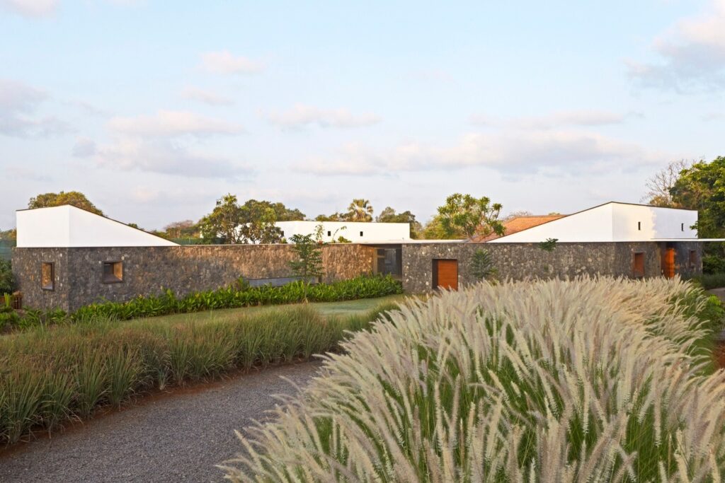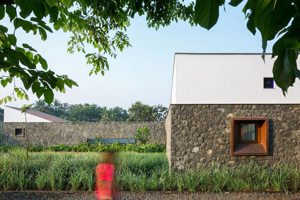 Използването на различни материали допълнително намалява визуалния обем на къщата. Долната част е изградена от местен базалтов камък, който осигурява здрава основа, докато горната част включва по-лека зидария и покрив с наклонени керемиди от Мангалор (щат Карнатака). Комбинацията от прости материали и разнообразни текстури регулира светлината и подчертава естественото богатство на всеки материал.
