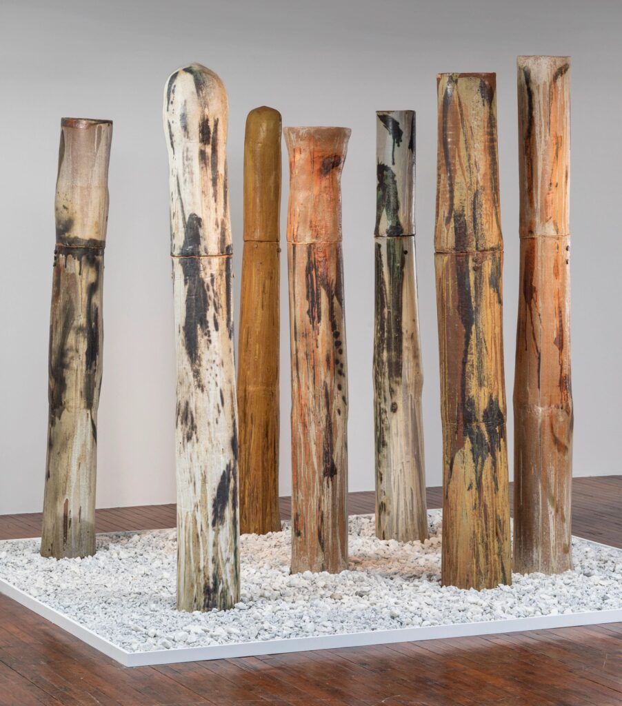 Керамичните форми наподобяват човешки сърца и торсове, затворени цилиндрични форми и огромни сфери, които тя нарича „луни“. Преди да запечата всяка от тези форми, Тошико пуска вътре увита в хартия топка от глина. Идеята е парчетата да „дрънчат“, когато се движат.
